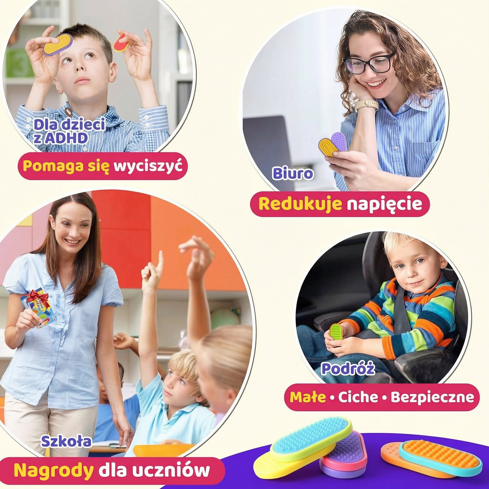 Zróżnicowane struktury wspierają rozwój motoryki małej, pomagają regulować emocje i utrzymać uwagę podczas lekcji, terapii lub odrabiania zadań.