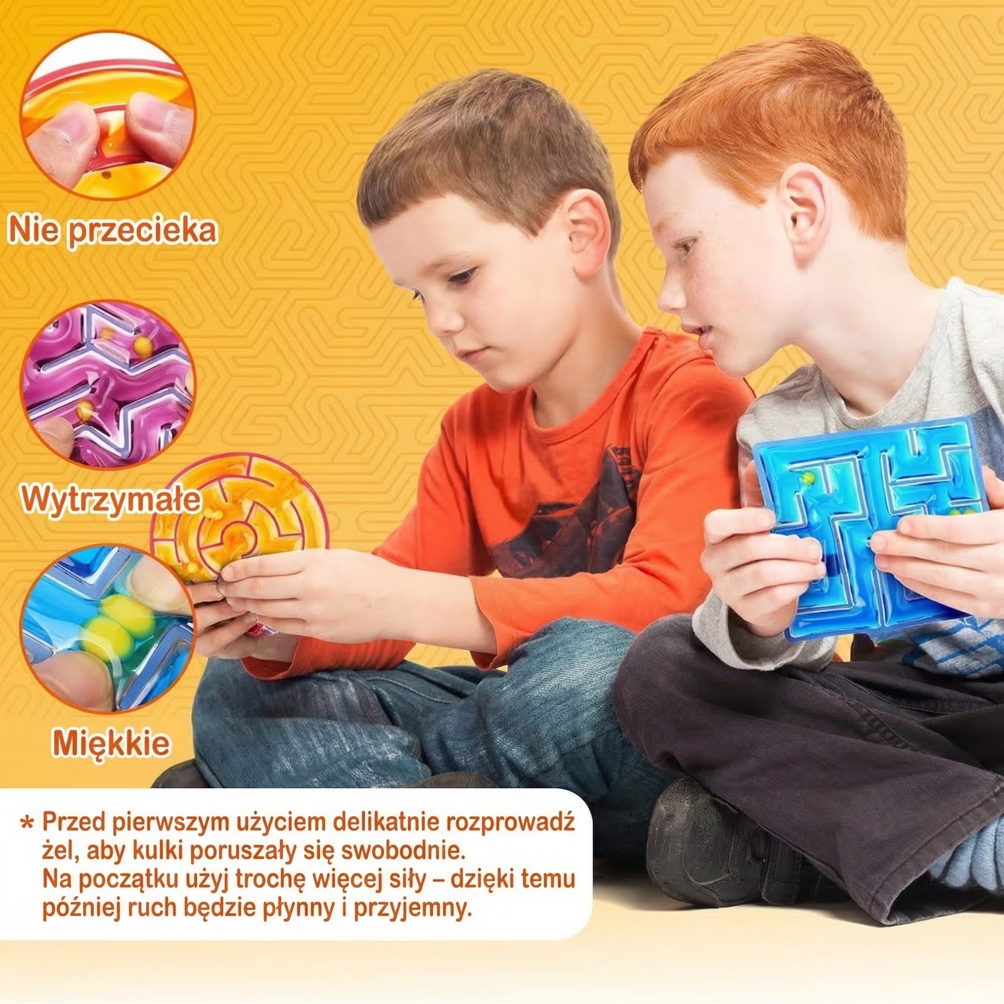 4 sensoryczne gniotki labiryntowe, z których każdy posiada inny kształt i tor ruchu, aby zapewnić zróżnicowaną i dopasowaną stymulację dotykową.
